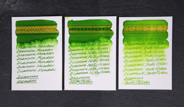 Diamine Meadow – Bleeds well when added to water. Turns a dull gold colour when subjected to bleach. A lovely deep rich green ink when used for writing. Diamine Kelly Green – Bleeds easily when added to water with yellow/green traces […]